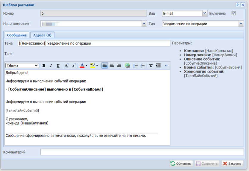 Справочники \ Шаблоны заявок \ Шаблоны рассылоксоздать шаблон рассылки, где указать:
