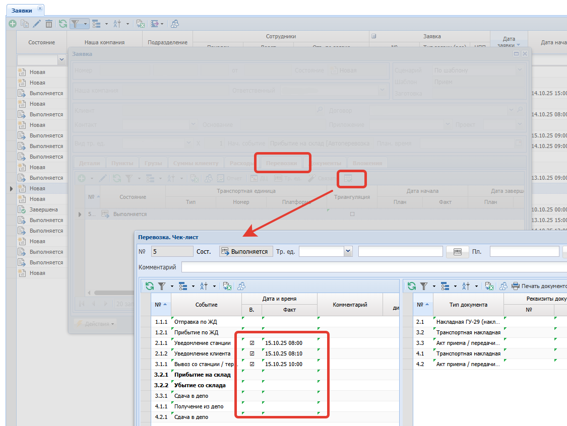 При выборе фактического времени события и установки флага в меню Клиенты \ Заявки \ Заявка \ Перевозка \ Чек-лист будет отправляться письмо клиенту.
